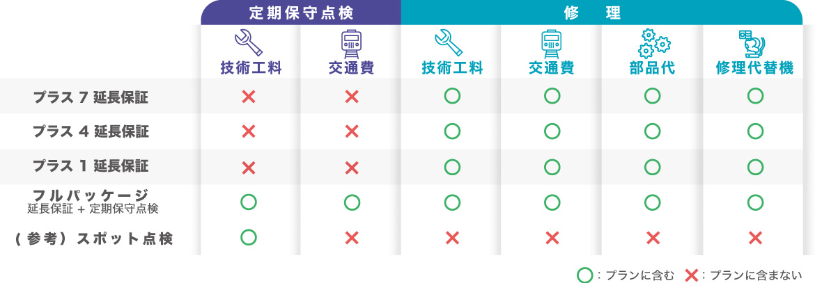 故障等が発見された場合は、修理完了後にご加入頂けます。 - 「プラス7延長保証」「プラス4延長保証」「プラス1延長保証」には、定期保守点検が含まれておりませんので、適切な時期にスポット点検をご用命ください。