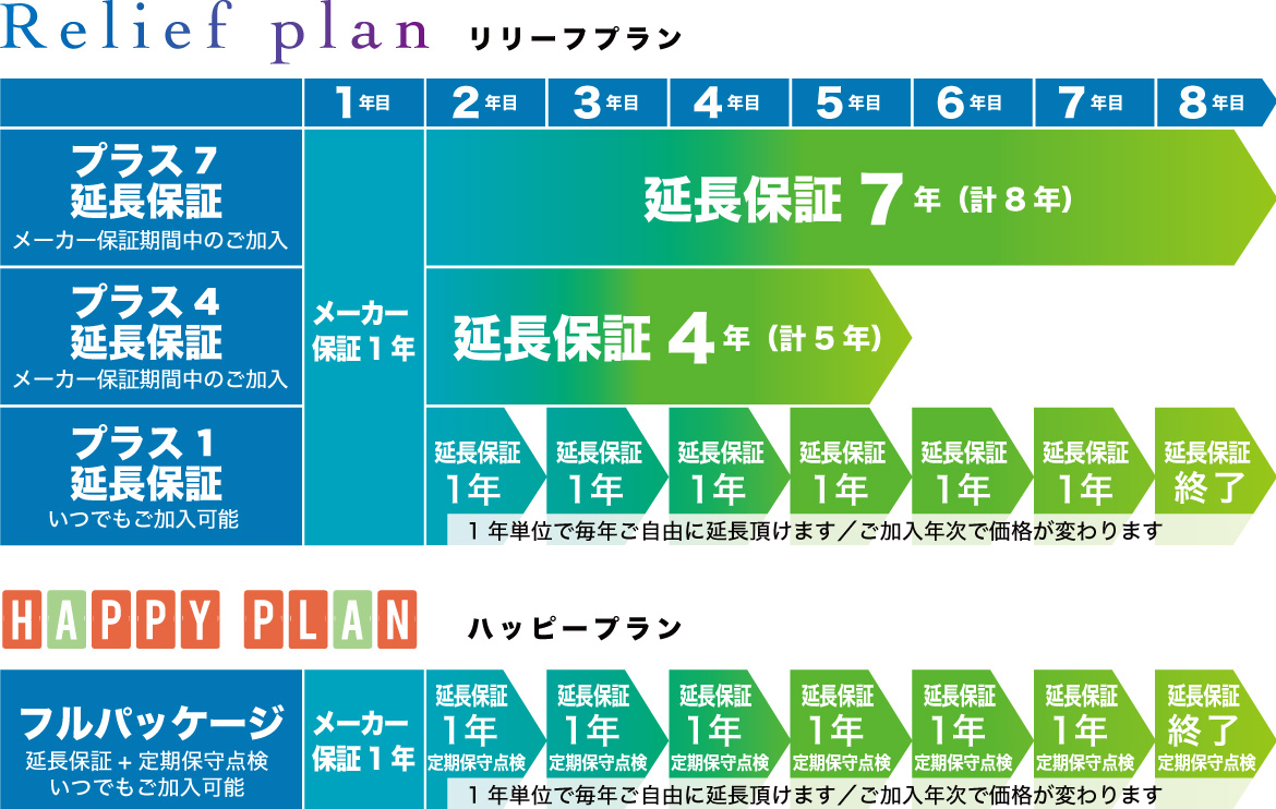 保証プランは、4つのプランをご用意しております。メーカー保証1年を更に7年・4年・1年と延長できる「プラス7延長保証」、「プラス4延長保証」、「プラス1延長保証」及び延長保証に定期保守点検をセットにした 「フルパッケージ」の4つのプランから、お客様のニーズと加入時期に応じてお選びいただけます。